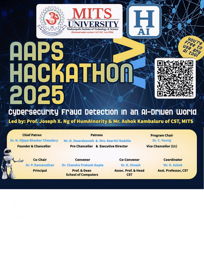 Tirupati, India — Fresh off its recent recognition as a full-fledged University in IndiaMadanapalle Institute of Technology & Science (MITS) University has partnered with U.S.-based nonprofit HuMAINority Inc. to launch the inaugural AI-Augmented Problem Solving (AAPS) Hackathon 2025, an international event uniting over 60 teams of students and mentors to tackle “Cybersecurity Fraud Detection in an AI-Driven World.”